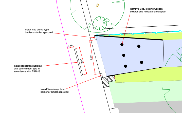 The plan is to end up with a guard rail on the footpath set 1/2m from the road running almost the full width of the ramp entrance:
