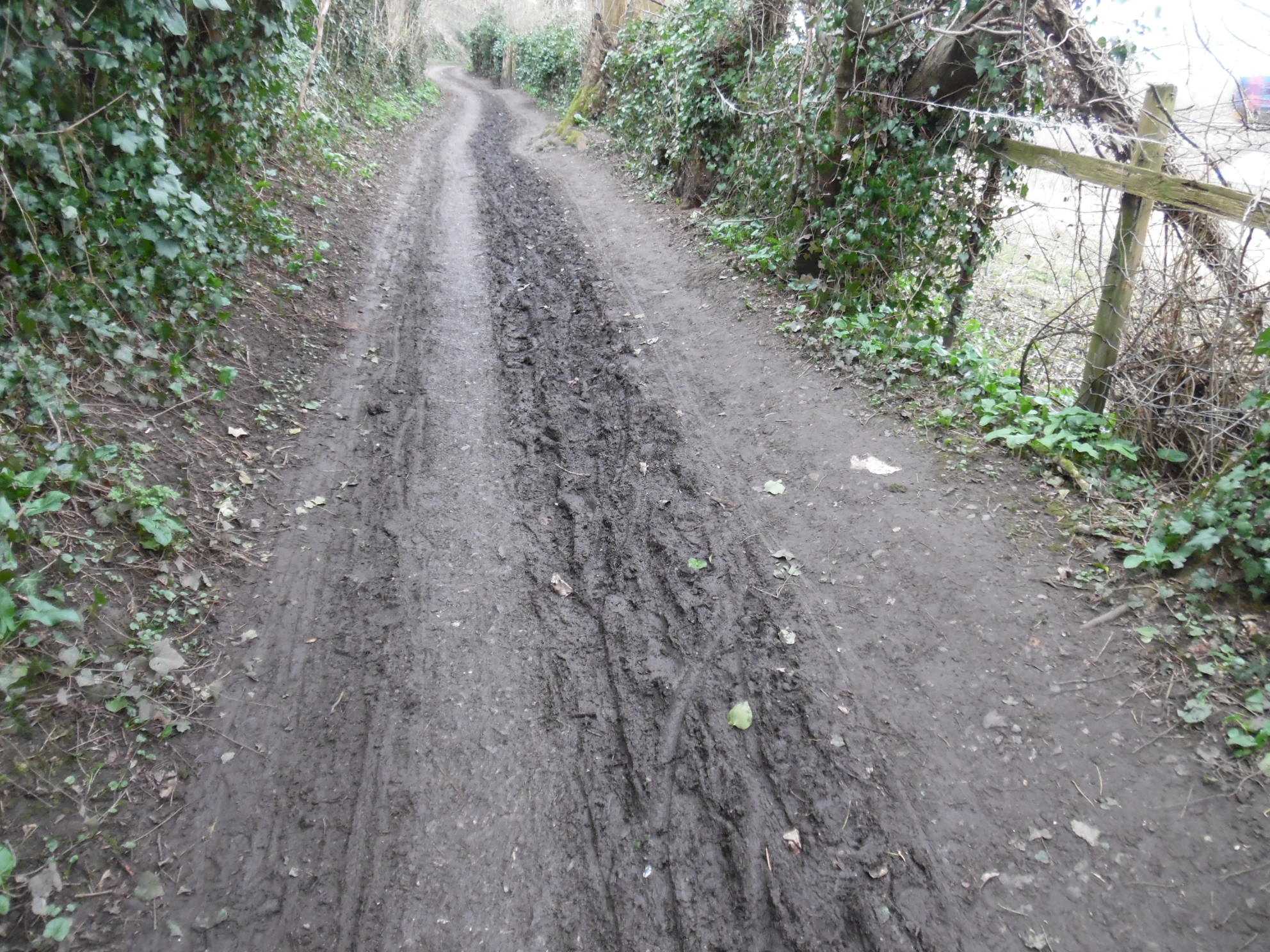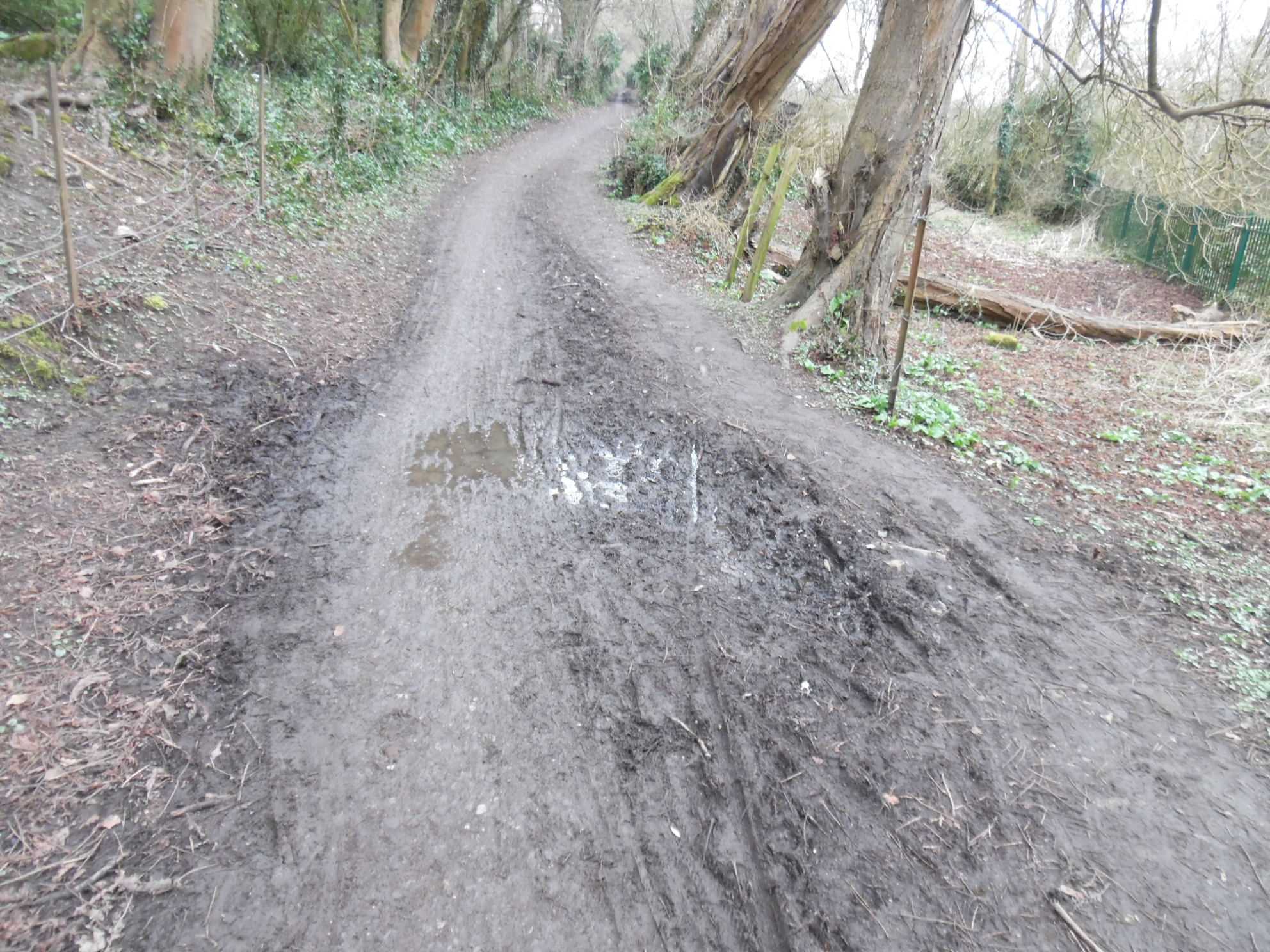 This is a typical winter condition at the entrances into the meadows, slippery on a bike, even with knobbly tyres. De rigueur footwear – wellies::