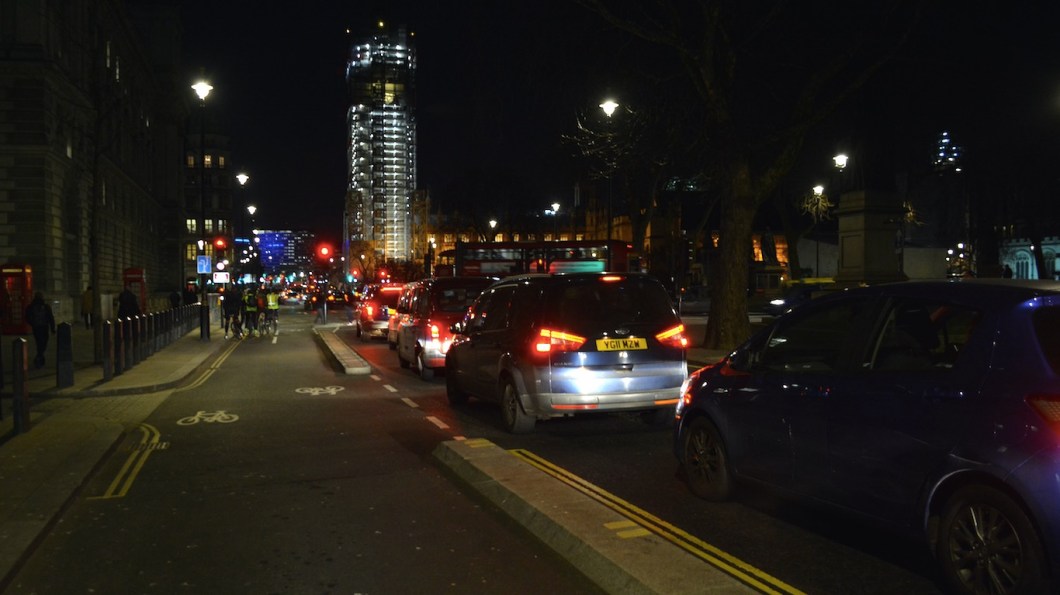 In front of me was perhaps the classic stereotypical scene shared by taxi drivers, and other people hostile to new cycling infrastructure in London (and other British towns and cities). A large expanse of empty tarmac loomed in front of me, contrasting starkly with the clogged road on the right. You might say the cycleway is ‘causing’ congestion and pollution, if you were so inclined.