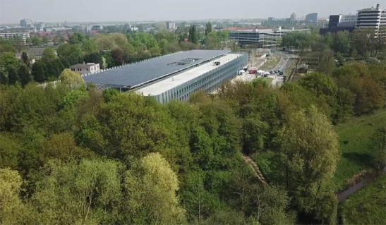 Once the outside is covered in green ivy this parking garage will be hidden in plain sight with all the green surrounding it. In the distance to the right: the city hospital. In the far distance: the city. Still from a video by the city of ʼs-Hertogenbosch.