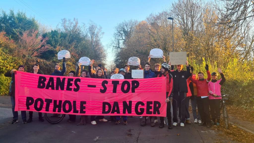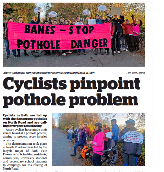 It proved to be a positive experience, coinciding with road safety week. About 30 people gathered, discussed experiences and passers by seemed supportive (not least because potholes are clearly a pain when driving too). The local Extinction Rebellion representative kindly re-purposed their bright pink banner, much to the surprise of some on the protest, who would never otherwise be likely seen on at XR march. Safety and cycling was a uniting force. The Bath Chronicle covered the story, and our campaign was timed appropriately to influence the BathNES Council budget allocation for 2024 road re-surfacing.
