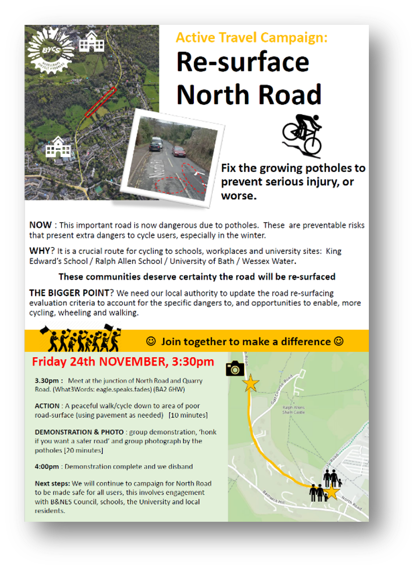 With no action or clarity in the years since, even the persistent calls for re-surfacing weren’t being met with confirmed budgets and dates. My action was to create a campaign poster explaining the issues and promoting a peaceful protest march on Friday 24th November. Guidance on organising a peaceful protest (like notifying the police in advance) was much appreciated from Councillor Saskia Heijltjes and Councillor Joanna Wright, as was their support on the day and ability to raise the profile of the event within BathNES Council. To their credit, the Cabinet Member for Highways, Councillor Manda Rigby, was also happy to listen to concerns beforehand too.
