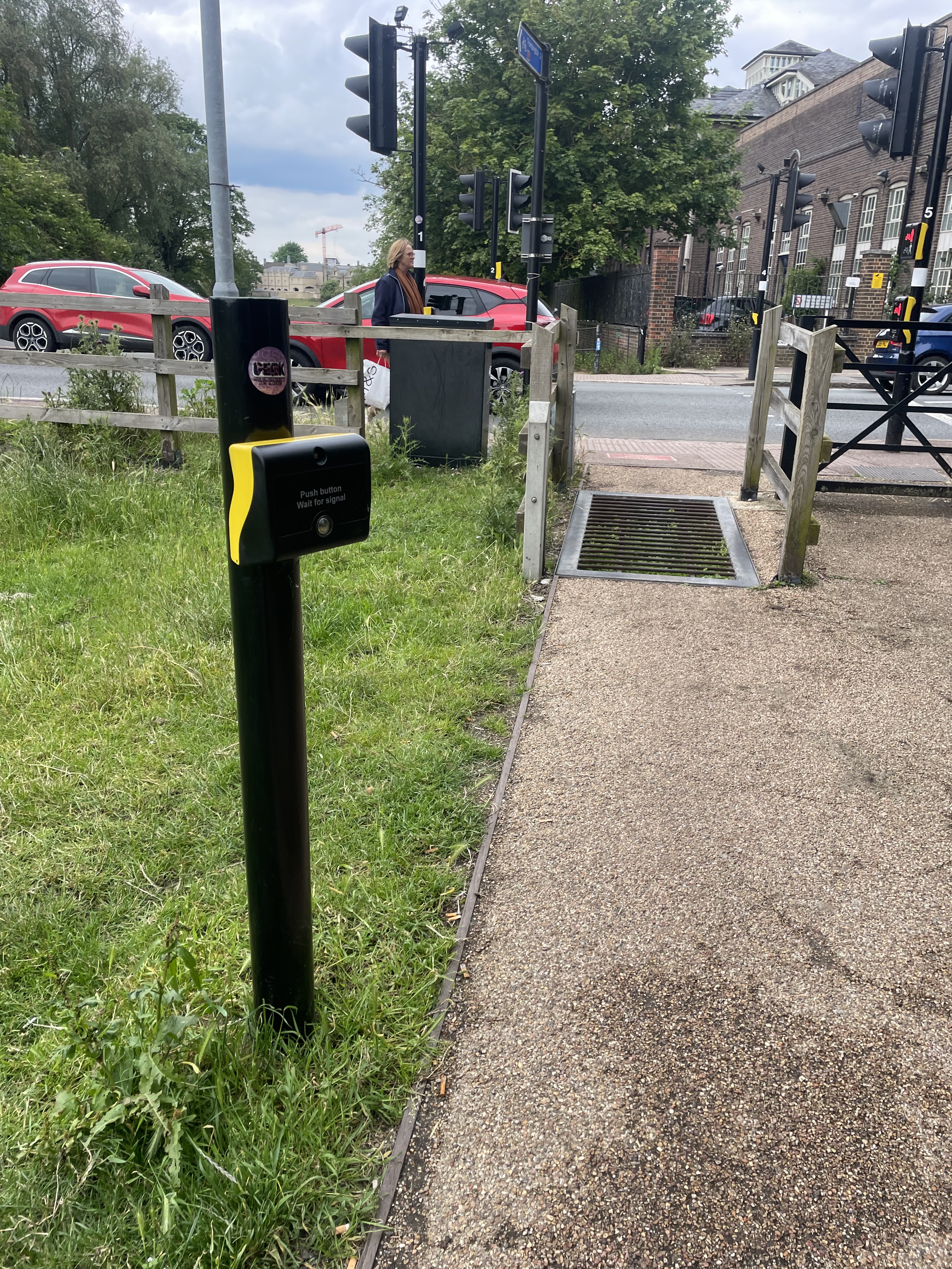 One quick detail to note on Toucan Crossings (btw- ‘Two-can’ as in pedestrians AND cyclists is a terrible, terrible pun… worthy of a Christmas cracker). Please design team, remember people on certain devices such as ‘box bikes’ and larger mobility scooters really struggle when the ‘beg button’ (you know, the one you press to ‘beg’ to be allowed to cross a road in your own city) is mounted on the signal post itself. Here is the design visualisation (left), and a strategically located ‘beg button’ in Cambridge, set well back from the kerb (right).