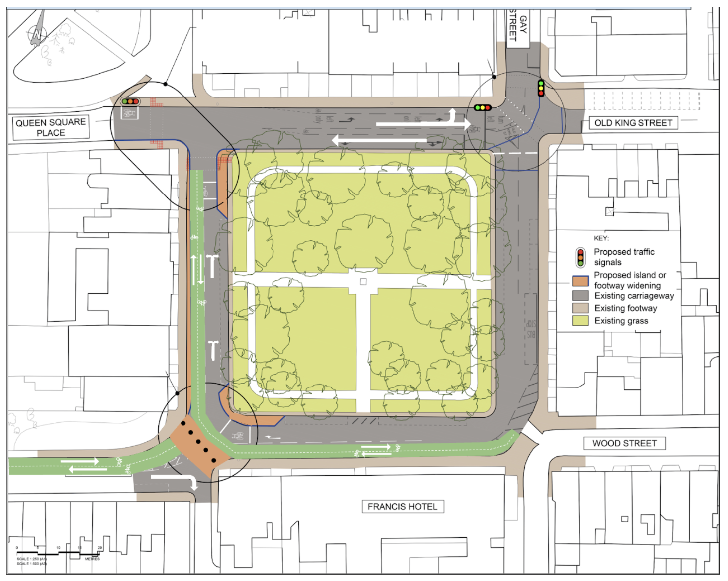 However, nowhere is the lack of ambition more stark than at Queen Square. This glorified roundabout (‘square-about’?) was once considered one of the finest Georgian squares in England. Now accessing the green space is a case of dashing across the road for those who can, and for people in wheelchairs- you can pretty much forget getting over there. And to be frank, why bother when the reward is sitting on a bench surrounded by noise and fumes?